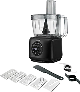 1000W 2.5L bowl capacity with 2.0L rotary switch with touch panel stepless speed control with pukse pre-program setting double safety switch big feeding mouth for whole potato and corrot LED decoration around switch chopper kneading coarse 7 fine shredding french fry blade coarse & fine scicing