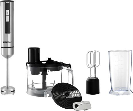4 in 1,Color: SS + Black,blender blade: crossing blade,Attachment: 4 in 1, hand blender, dual beater, beaker,Processing bowl with 3 blades (chopper, grater, slicer),Power: 600W DC motor,low noise,Full S.S hand blender,Multiple speeds with turbo,Blue power on indication light,UNIQUE CROSSING BLADE